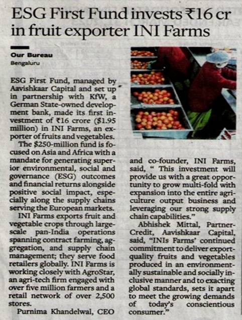 Aavishkaar Capital invests INR 16 Crores in INI Farms: Exclusive Coverage in Hindu Business Line, Deal Street Asia, VCCircle and Others